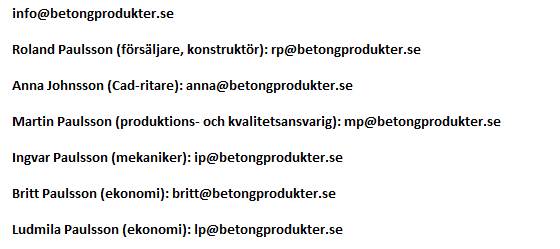 Adress: Betongprodukter i Högsäter AB Ånnerudsvägen 10 S-458 96 Högsäter Sverige GPS: För dej som använder gps så har vår fabrik kordinaterna: E 12º Telefonnummer +46 (0)528-402 75 E-post